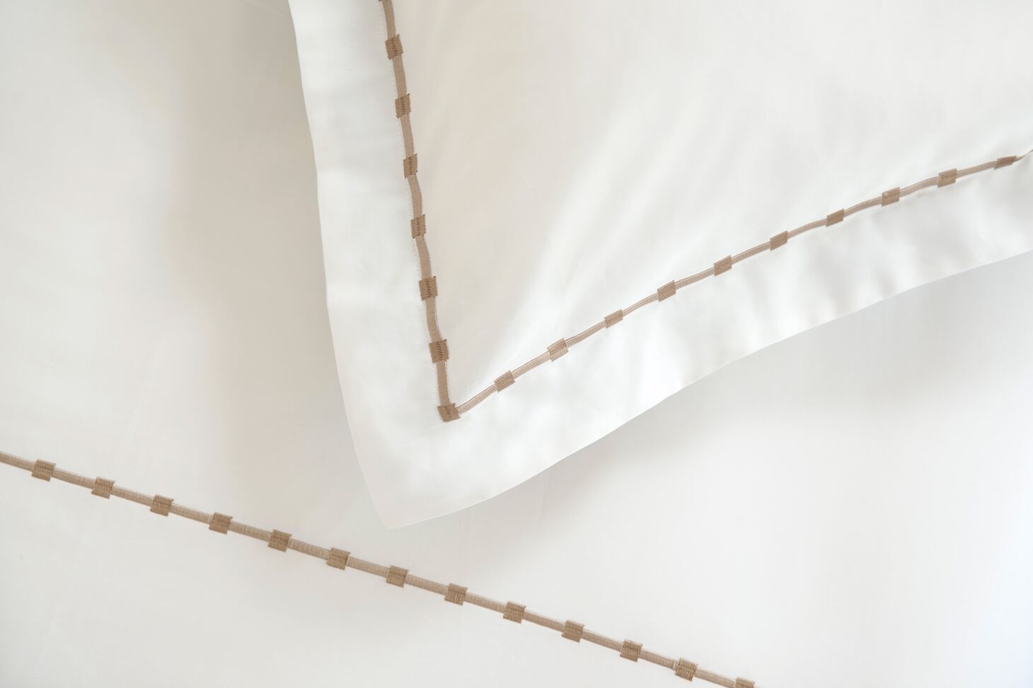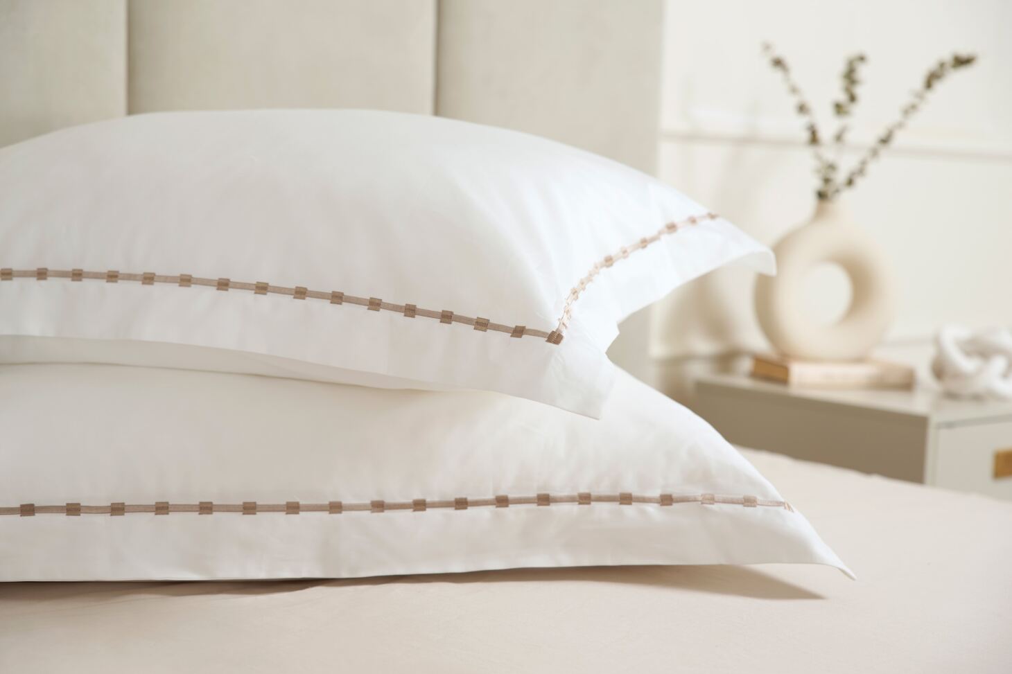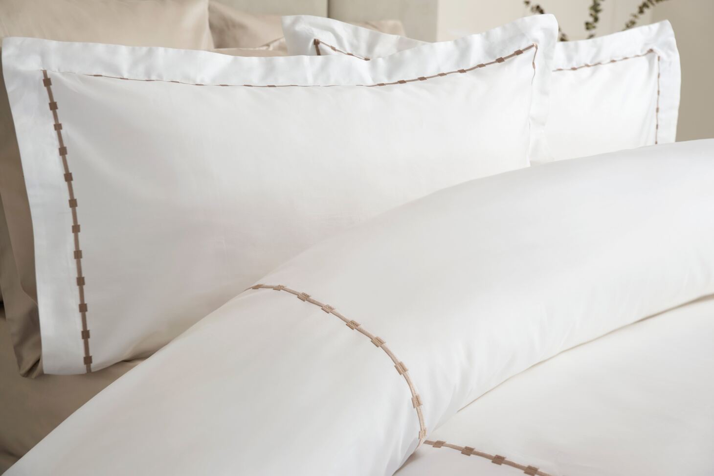 The crisp white fabric is beautifully finished with delicate taupe embroidery, adding a touch of refined sophistication to your bedroom. Ideal for those who appreciate timeless style, superior softness and a calming sleep space, Vivaan is perfect for creating a serene retreat.