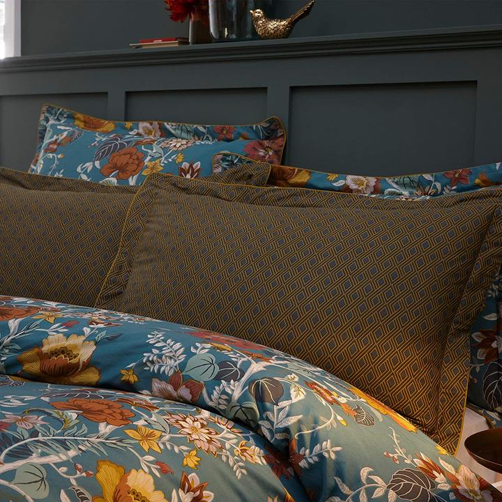 Luxurious and rich in tone, Bloom depicts voluptuous, exotic floral vines at dusk, climbing and twirling tall in columns. This soft cotton sateen bedding is truely luxurious, and features a luxe, deco-inspired geometric print on reverse and mustard gold piped edges. Pillowcases feature a piped oxford edge. 200 thread count luxury sateen cotton.