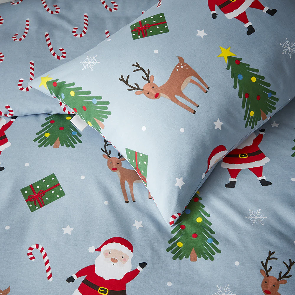 Bring festive cheer to your bedroom with the Vantona Home Santa & Friends Christmas bedding set. Featuring Santa, reindeer, Christmas trees, candy canes, and gifts on a snowy blue background, this playful Christmas duvet cover and pillowcase set is perfect for creating a fun and cosy holiday atmosphere.